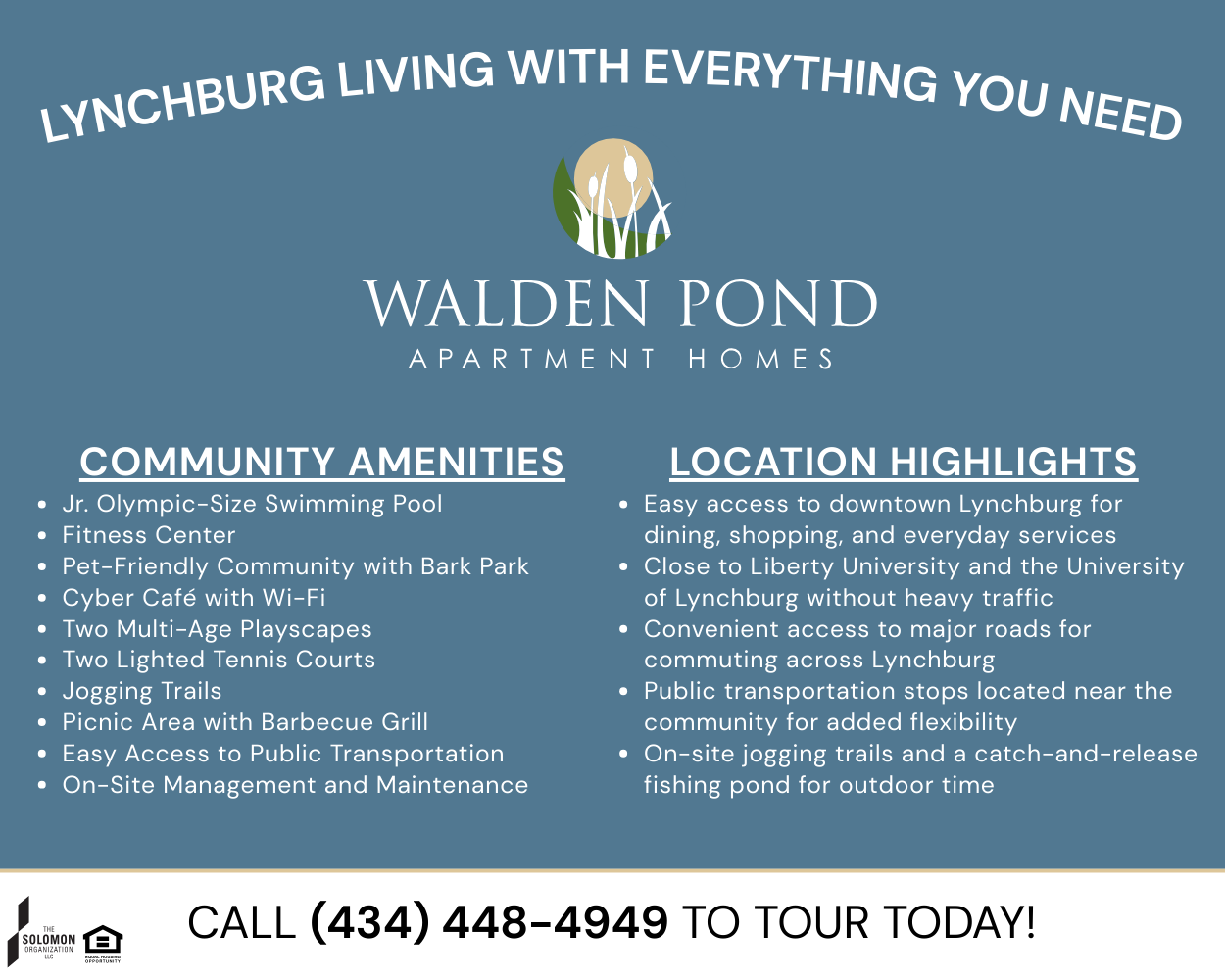 Tour Walden Pond Apartment Homes today and experience spacious living, community amenities, and a convenient Lynchburg location. Availability is limited. Apply now to make Walden Pond your next home!